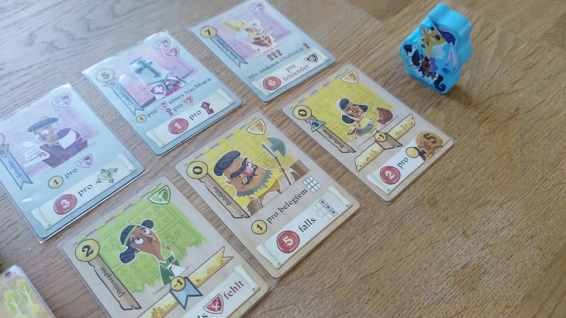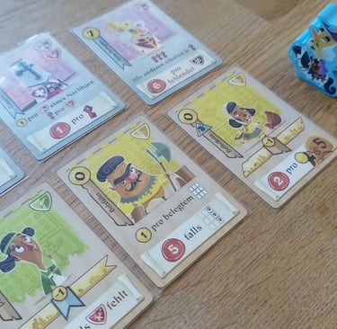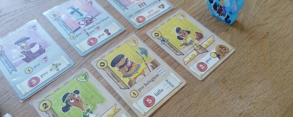 Ein weiterer Clou ist die Wertung: Die Karten haben Wappen in verschiedenen Farben, und ihr versucht z.B. möglichst viele angrenzende Wappen in eurem Raster zu kombinieren, um Punkte zu erzielen. Manche Karten verlangen sogar, dass ihr bestimmte Wappenkombinationen vermeidet, um hohe Punkte zu erhalten.