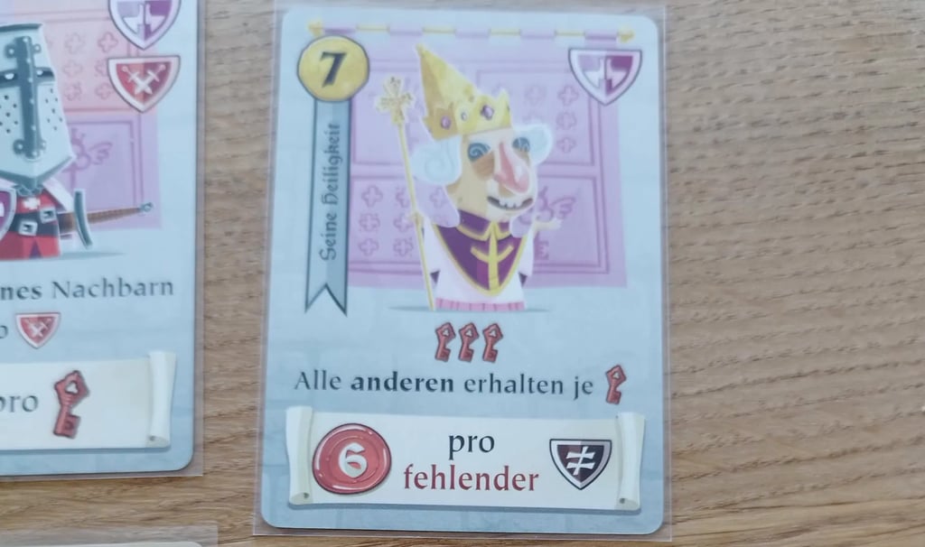 Der Herold sorgt außerdem für Interaktion, denn wenn ihr eine Karte nehmt, die den Herold nach oben oder unten verschiebt, müssen eure Mitspieler eventuell Schlüssel bezahlen oder Karten nehmen, die ihnen nicht unbedingt helfen. So gibt es auch einen kleinen Ärgerfaktor, der das Spiel zusätzlich belebt.